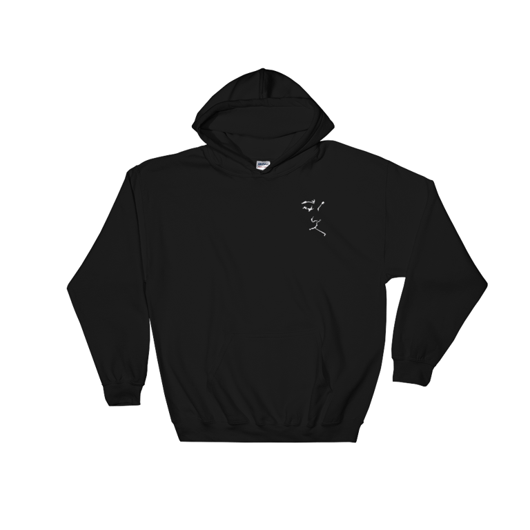 Super soft and smooth unisex black hooded sweatshirt with white embroidered "Thinker" sketch on the left chest.